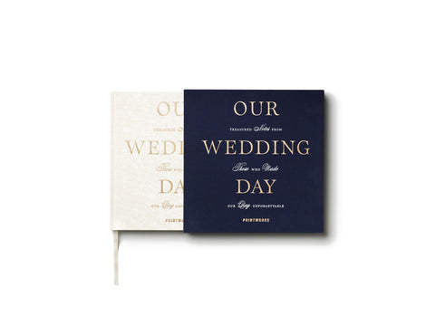 In het prachtig ontworpen Our Wedding Day gastenboek van Printworks verzamel je de meest waardevolle herinneringen aan jullie trouwdag. Een bundel vol warme wensen, lieve woorden en persoonlijke boodschappen van de mensen die deze bijzondere dag met jullie deelden. Met zijn ivoorwitte kaft en elegante marineblauwe hoes is het gastenboek niet alleen een stijlvolle aanvulling op jullie bruiloft, maar ook een tijdloos aandenken dat jarenlang gekoesterd kan worden. De 100 pagina’s bieden alle ruimte voor gasten om hun gelukswensen, herinneringen en anekdotes met jullie te delen.