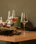 Het Witte wijnglas uit de Duo serie van het merk Zwiesel Glas combineert traditioneel vakmanschap met moderne technologie, waardoor een unieke glaservaring ontstaat. Beschreven als een "filigraan maar functionele glaservaring", combineert de Duo collectie letterlijk vakmanschap met ultramoderne machineprecisie. De machines van Zwiesel Glas produceren met absolute precisie de kelk van de glazenserie. De delicate, elegante kelk straalt lichtheid en stabiliteit uit, terwijl de flinterdunne steel en de brede voet zijn gemaakt door meester-glasblazers.