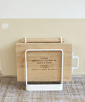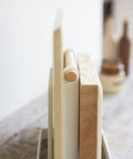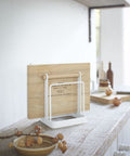 Ben je het beu dat je snijplanken blijven omvallen? Houd je meest gebruikte snijplanken rechtop en bij de hand met deze elegante standaard van Yamazaki. De standaard is perfect voor kleine snijplanken en kaas planken. Het is verdeeld in twee delen door middel van een houten handvat.