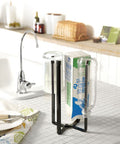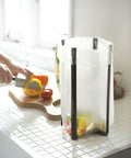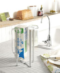 De kitchen stand van Yamazaki is multifuntioneel: het kan gebruikt worden om een zakje vast te houden voor keukenafval, maar ook om glazen, bekers of babyflessen te drogen. De standaard is klein en compact en kan worden opevouwen om makkelijk te op te bergen,