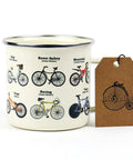 Hou je van fietsen? Deze geëmailleerde mok van Gift Republic is perfect voor alle fietsliefhebbers en avonturiers! Geniet van een lekker kopje thee of koffie uit deze mok met prachtige illustraties van de meest iconische fietsen uit de geschiedenis!