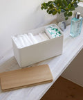 In deze sanitaire box van Yamazaki kun je douchespulletjes of andere kleine artikelen opbergen. Door de houten bekleding voegt het een elegant accent toe aan je badkamer of een andere kamer natuurlijk. Gemaakt van staal en hout en ontworpen in Japan.
