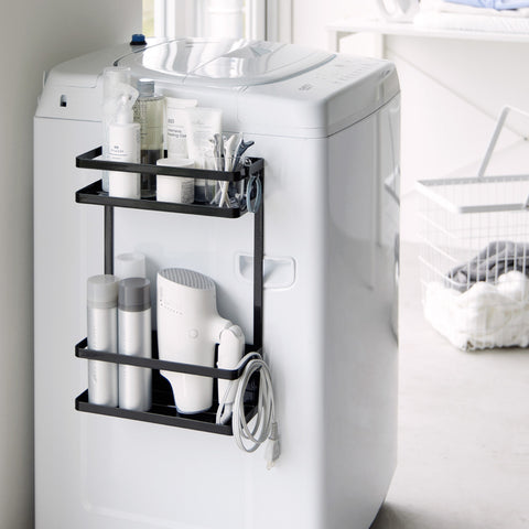 Dit magnetische wasmiddelrek van Yamazaki kan eenvoudig worden bevestigd aan een wasmachine of ander metalen oppervlak. Het biedt opbergruimte op twee niveaus, ideaal voor het organiseren van wasmiddel, badkamerbenodigdheden of andere items die je graag binnen handbereik houdt. De twee meegeleverde haken zorgen daarnaast voor extra ophangmogelijkheden.