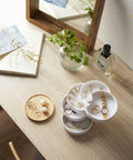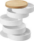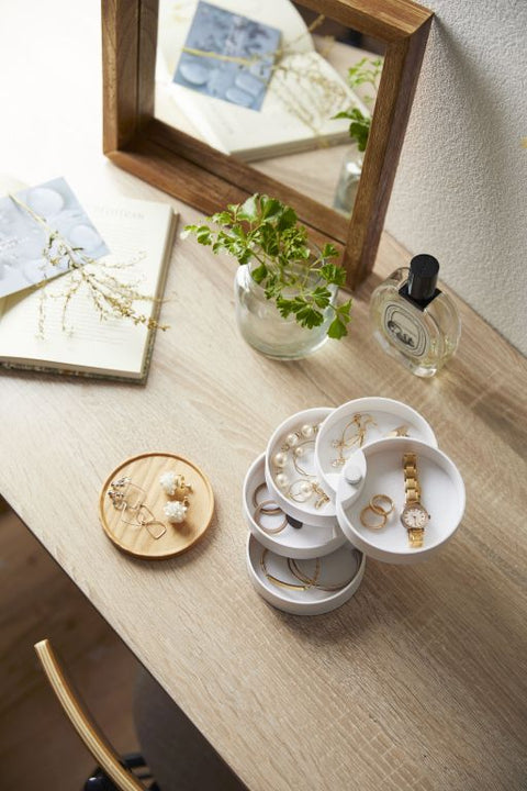 Yamazaki's elegante accessory case heeft vijf handige draaibare bakjes met een uitneembaar houten dienblad om je sieraden overzichtelijk en georganiseerd te houden. Draai gewoon aan de laag die je nodig hebt om gemakkelijk toegang te krijgen tot je sieraden of schuif ze er allemaal uit om een chique hoogtepunt te creëren.