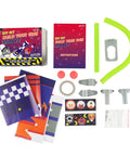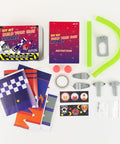 Inhoud: 3 raket ontwerpen, 9 raketvinnen, 2 schuim raketkoppen, 2 stickervellen, dubbelzijdig plakband, lanceerstandaard onderdelen en een instructieboekje.
