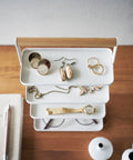 Met deze eenvoudig ontworpen accessoire houder kun je je favoriete accessoires op de meest mooie manier bewaren. De combinatie van wit staal en natuurlijk hout verbetert elke kamer. Het handvat aan de bovenzijde maakt het makkelijk om mee te nemen. Gemaakt van staal en hout en ontworpen in Japan.