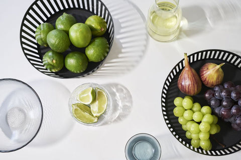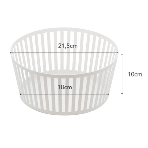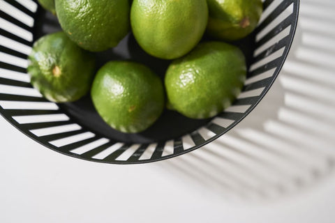 De schaduw van de lijnen van deze fruitmand dansen. Deze stijlvolle fruitmand staat prachtig op tafel.