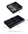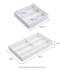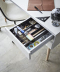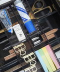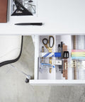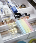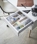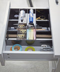 Deze handige uitschuifbare oranizer van Yamazaki past nagenoeg in iedere bureau lade. De vijf ruime basiscompartimenten kunnen worden uitgebreid met een acryllade voor extra opbergruimte.