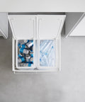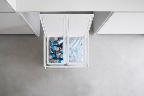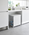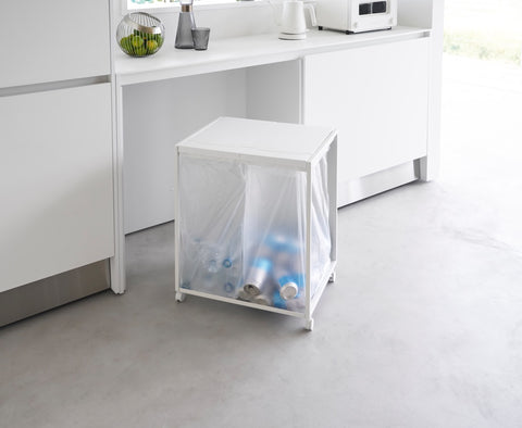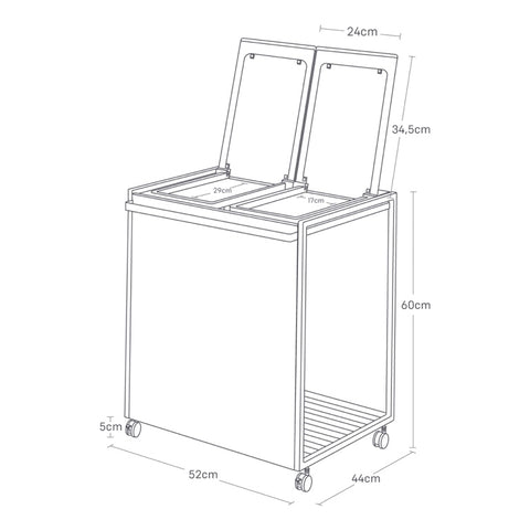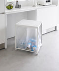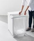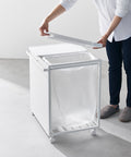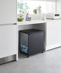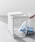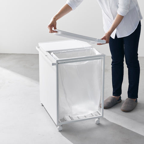 Deze prullenbak van Yamazaki heeft twee compartimenten waarin je boodschappen- of vuilniszakken kunt hangen. Dankzij de praktische wieltjes en handgreep verplaats je de prullenbak moeiteloos naar iedere gewenste plek. De deksel biedt niet alleen een discrete afsluiting, maar is ook gemakkelijk te openen en blijft dankzij een siliconenstopper op zijn plek staan, handig tijdens het vervangen van de zakken. Daarnaast biedt de onderste plank extra opbergruimte voor je voorraad vuilniszakken of andere benodigdheden.