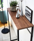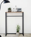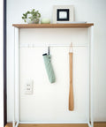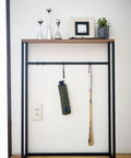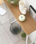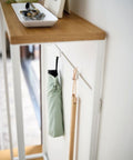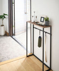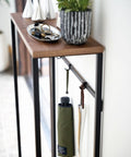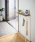 Voeg elegantie toe aan uw entree! De Console Table van Yamazaki is een handige en ruimtebesparende oplossing. Het houten blad zorgt voor expressief minimalisme. Gebruik de haken om paraplu's of schoenlepels aan op te hangen.